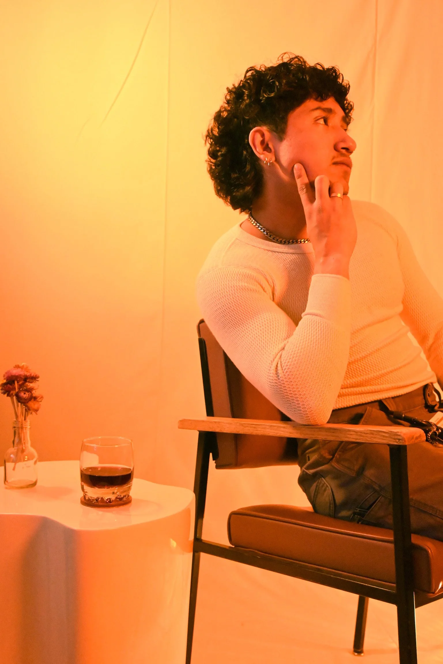 — For this shoot the theme was Summer Wine Night. In order to capture feeling I tried to find a nice peachy tan color to add warmth to the set, and a nice mauve leather chair to help the models feel comfortable.